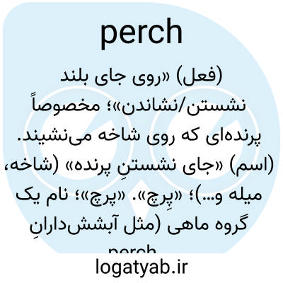 (فعل) «روی جای بلند نشستن/نشاندن»؛ مخصوصاً پرنده‌ای که روی شاخه می‌نشیند. (اسم) «جای نشستنِ پرنده» (شاخه، میله و…)؛ «پِرچ». «پرچ»؛ نام یک گروه ماهی (مثل آبشش‌دارانِ perch).