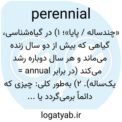 «چند‌ساله / پایا»؛ ۱) در گیاه‌شناسی، گیاهی که بیش از دو سال زنده می‌ماند و هر سال دوباره رشد می‌کند (در برابر annual = یک‌ساله). ۲) به‌طور کلی: چیزی که دائماً برمی‌گردد یا همیشه هست (a perennial problem).