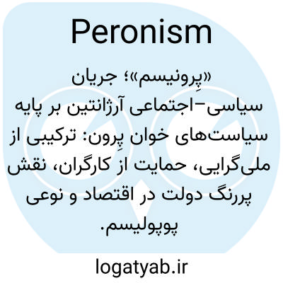 «پِرونیسم»؛ جریان سیاسی–اجتماعی آرژانتین بر پایه سیاست‌های خوان پِرون: ترکیبی از ملی‌گرایی، حمایت از کارگران، نقش پررنگ دولت در اقتصاد و نوعی پوپولیسم.