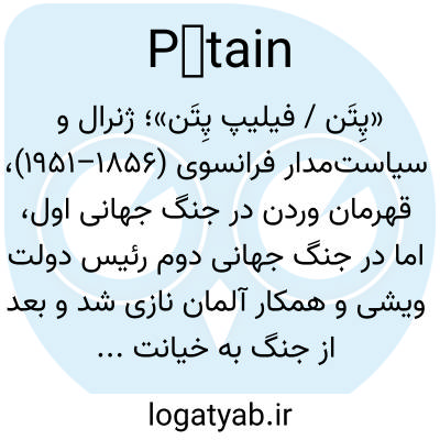 «پِتَن / فیلیپ پِتَن»؛ ژنرال و سیاست‌مدار فرانسوی (۱۸۵۶–۱۹۵۱)، قهرمان وردن در جنگ جهانی اول، اما در جنگ جهانی دوم رئیس دولت ویشی و همکار آلمان نازی شد و بعد از جنگ به خیانت محکوم گردید.