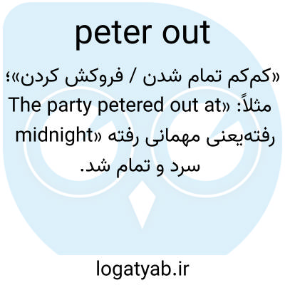 «کم‌کم تمام شدن / فروکش کردن»؛ مثلاً: «The party petered out at midnight» یعنی مهمانی رفته‌رفته سرد و تمام شد.
