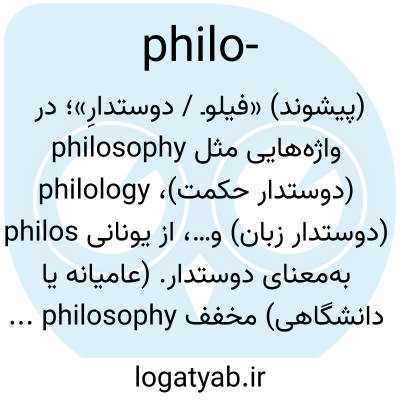 (پیشوند) «فیلوـ / دوستدارِ»؛ در واژه‌هایی مثل philosophy (دوستدار حکمت)، philology (دوستدار زبان) و…، از یونانی philos به‌معنای دوستدار. (عامیانه یا دانشگاهی) مخفف philosophy یا philosophical در نام واحدهای درسی یا رشته‌ها (مثلاً «Intro to Philo» = مقدمه‌ای بر فلسفه).