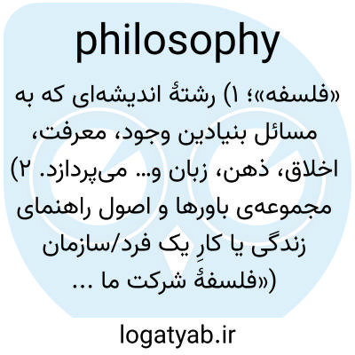 «فلسفه»؛ ۱) رشتهٔ اندیشه‌ای که به مسائل بنیادین وجود، معرفت، اخلاق، ذهن، زبان و… می‌پردازد. ۲) مجموعه‌ی باورها و اصول راهنمای زندگی یا کارِ یک فرد/سازمان («فلسفهٔ شرکت ما…»).