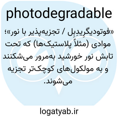 «فوتودیگرِیدِبِل / تجزیه‌پذیر با نور»؛ موادی (مثلاً پلاستیک‌ها) که تحت تابش نور خورشید به‌مرور می‌شکنند و به مولکول‌های کوچک‌تر تجزیه می‌شوند.