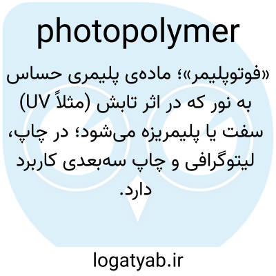 «فوتوپلیمر»؛ ماده‌ی پلیمری حساس به نور که در اثر تابش (مثلاً UV) سفت یا پلیمریزه می‌شود؛ در چاپ، لیتوگرافی و چاپ سه‌بعدی کاربرد دارد.