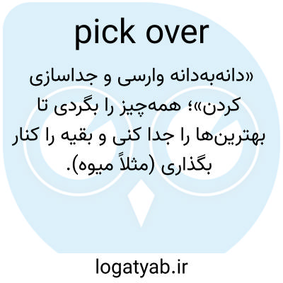 📌 مرتب کردن، بررسی کردن مورد به مورد، مانند «پدر از انتخاب کردن یکی یکی لوبیاها متنفر است». این اصطلاح گاهی اوقات به عنوان «انتخاب شده» نیز استفاده میشود و چیزی را توصیف میکند که قبلاً از بین آنها انتخاب شده است (مانند «آنها تقریباً هیچ چیز باقی نماندهاند؛ موجودی لباسهای شنا انتخاب شده است». [نیمه اول دهه ۱۸۰۰]