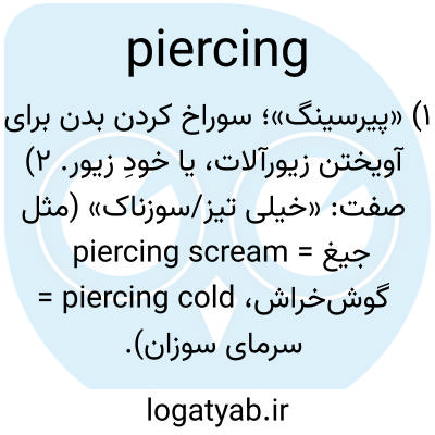 ۱) «پیرسینگ»؛ سوراخ کردن بدن برای آویختن زیورآلات، یا خودِ زیور. ۲) صفت: «خیلی تیز/سوزناک» (مثل piercing scream = جیغ گوش‌خراش، piercing cold = سرمای سوزان).