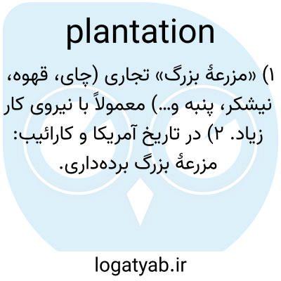 📌 مزرعه یا ملک بزرگی در یک منطقه گرمسیری یا نیمهگرمسیری، برای کشت پنبه، تنباکو، قهوه، نیشکر و غیره، که معمولاً توسط کارگران ساکن به بردگی گرفته شده، بدون مزد یا با دستمزد کم انجام میشود.