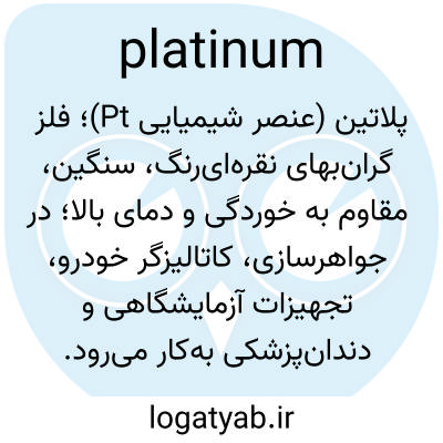 📌 شیمی.، یک عنصر فلزی سنگین، به رنگ سفید مایل به خاکستری، بسیار چکشخوار و شکلپذیر، مقاوم در برابر اکثر مواد شیمیایی، عملاً اکسیدنشدنی جز در حضور بازها، و فقط در دماهای بسیار بالا قابل ذوب: برای ساخت دستگاههای شیمیایی و علمی، به عنوان کاتالیزور در اکسیداسیون آمونیاک به اسید نیتریک، و در جواهرات استفاده میشود. Pt; 195.09; 78; 21.5 در دمای 20 درجه سانتیگراد.