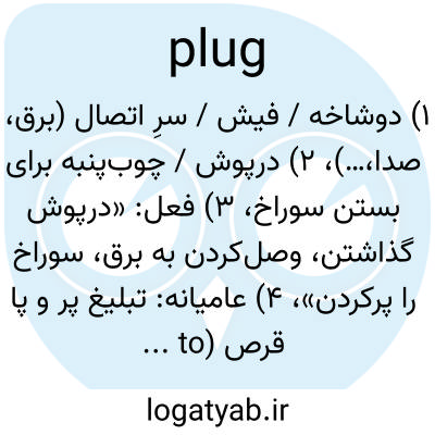 ۱) دو‌شاخه / فیش / سرِ اتصال (برق، صدا،…)، ۲) درپوش / چوب‌پنبه برای بستن سوراخ، ۳) فعل: «درپوش گذاشتن، وصل‌کردن به برق، سوراخ را پرکردن»، ۴) عامیانه: تبلیغ پر و پا قرص (to plug a book).