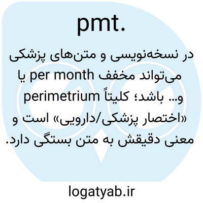 در نسخه‌نویسی و متن‌های پزشکی می‌تواند مخفف per month یا perimetrium و… باشد؛ کلیتاً «اختصار پزشکی/دارویی» است و معنی دقیقش به متن بستگی دارد.