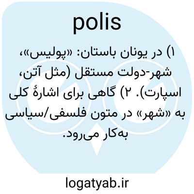۱) در یونان باستان: «پولیس»، شهر-دولت مستقل (مثل آتن، اسپارت). ۲) گاهی برای اشارهٔ کلی به «شهر» در متون فلسفی/سیاسی به‌کار می‌رود.