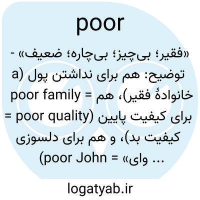 «فقیر؛ بی‌چیز؛ بی‌چاره؛ ضعیف» - توضیح: هم برای نداشتن پول (a poor family = خانوادهٔ فقیر)، هم برای کیفیت پایین (poor quality = کیفیت بد)، و هم برای دلسوزی (poor John = «وای بدبخت جان») به‌کار می‌رود.