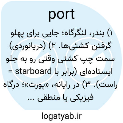 ۱) بندر، لنگرگاه؛ جایی برای پهلو گرفتن کشتی‌ها. ۲) (دریانوردی) سمت چپ کشتی وقتی رو به جلو ایستاده‌ای (برابر با starboard = راست). ۳) در رایانه، «پورت»؛ درگاه فیزیکی یا منطقی ارتباط داده (مثل USB port، port 80). ۴) نوعی شراب تقویتی شیرین به‌نام port wine.