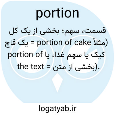 قسمت، سهم؛ بخشی از یک کل (مثلاً portion of cake = یک قاچ کیک یا سهم غذا، یا portion of the text = بخشی از متن).