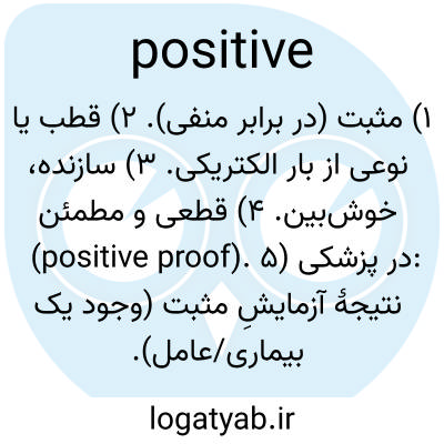 ۱) مثبت (در برابر منفی). ۲) قطب یا نوعی از بار الکتریکی. ۳) سازنده، خوش‌بین. ۴) قطعی و مطمئن (positive proof). ۵) در پزشکی: نتیجهٔ آزمایشِ مثبت (وجود یک بیماری/عامل).