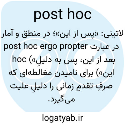لاتینی: «پس از این»؛ در منطق و آمار در عبارت post hoc ergo propter hoc («بعد از این، پس به دلیلِ این») برای نامیدن مغالطه‌ای که صرفِ تقدمِ زمانی را دلیلِ علیت می‌گیرد.
