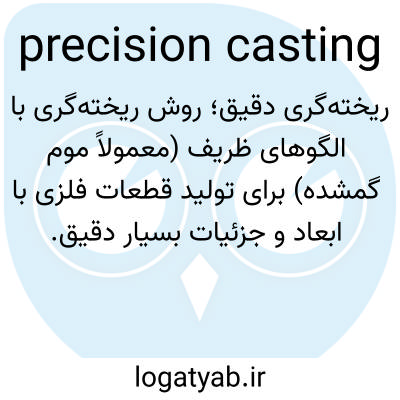 ریخته‌گری دقیق؛ روش ریخته‌گری با الگوهای ظریف (معمولاً موم گمشده) برای تولید قطعات فلزی با ابعاد و جزئیات بسیار دقیق.