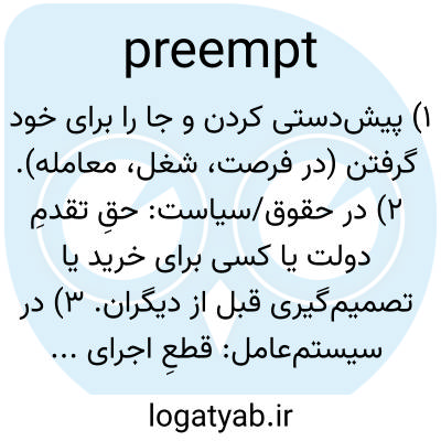 ۱) پیش‌دستی کردن و جا را برای خود گرفتن (در فرصت، شغل، معامله). ۲) در حقوق/سیاست: حقِ تقدمِ دولت یا کسی برای خرید یا تصمیم‌گیری قبل از دیگران. ۳) در سیستم‌عامل: قطعِ اجرای یک فرایند برای اجرای فرایند دیگر (preemptive multitasking).