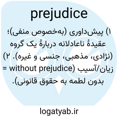 ۱) پیش‌داوری (به‌خصوص منفی)؛ عقیدهٔ ناعادلانه دربارهٔ یک گروه (نژادی، مذهبی، جنسی و غیره). ۲) زیان/آسیب (without prejudice = بدون لطمه به حقوق قانونی).
