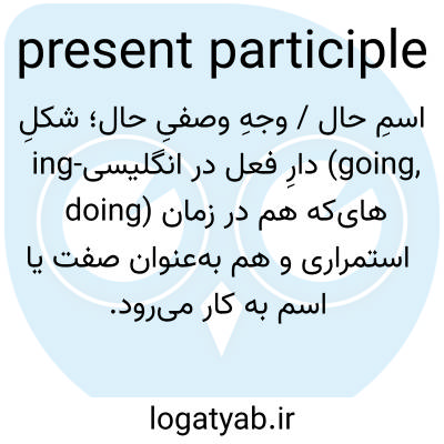 📌 دستور زبان.، وجه وصفی، در انگلیسی با پسوند -ing، که تکرار یا مدت زمان یک فعالیت یا رویداد را بیان میکند: به عنوان صفت استفاده میشود، مانند «علفهای هرز در حال رشد» و «خورشید در حال غروب»، و همچنین در ساخت ساختارهای فعلی استمراری، مانند «علفهای هرز در حال رشد هستند» و «خورشید در حال غروب بود».