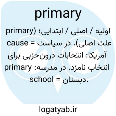 اولیه / اصلی / ابتدایی؛ (primary cause = علت اصلی). در سیاست آمریکا: انتخابات درون‌حزبی برای انتخاب نامزد. در مدرسه: primary school = دبستان.