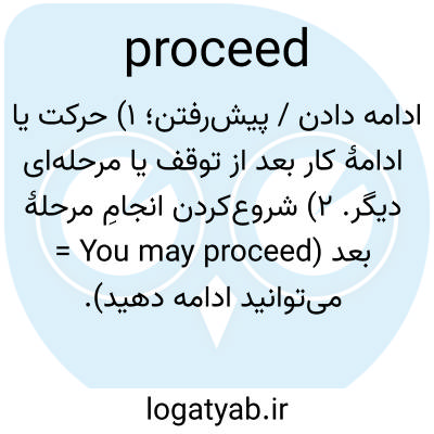 ادامه دادن / پیش‌رفتن؛ ۱) حرکت یا ادامهٔ کار بعد از توقف یا مرحله‌ای دیگر. ۲) شروع‌کردن انجامِ مرحلهٔ بعد (You may proceed = می‌توانید ادامه دهید).