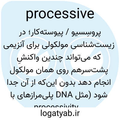 پروسِسیو / پیوسته‌کار؛ در زیست‌شناسی مولکولی برای آنزیمی که می‌تواند چندین واکنشِ پشت‌سرهم روی همان مولکول انجام دهد بدون این‌که از آن جدا شود (مثل DNA پلی‌مرازهای با processivity بالا).