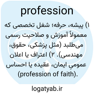 ۱) پیشه، حرفه؛ شغل تخصصی که معمولاً آموزش و صلاحیت رسمی می‌طلبد (مثل پزشکی، حقوق، مهندسی). ۲) اعتراف یا اعلان عمومیِ ایمان، عقیده یا احساس (profession of faith).