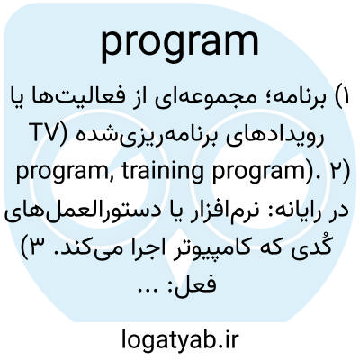 ۱) برنامه؛ مجموعه‌ای از فعالیت‌ها یا رویدادهای برنامه‌ریزی‌شده (TV program, training program). ۲) در رایانه: نرم‌افزار یا دستورالعمل‌های کُدی که کامپیوتر اجرا می‌کند. ۳) فعل: برنامه‌ریزی کردن یا برنامه‌نویسی کردن (to program a computer).