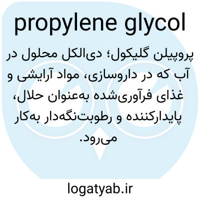پروپیلن گلیکول؛ دی‌الکل محلول در آب که در داروسازی، مواد آرایشی و غذای فرآوری‌شده به‌عنوان حلال، پایدارکننده و رطوبت‌نگه‌دار به‌کار می‌رود.