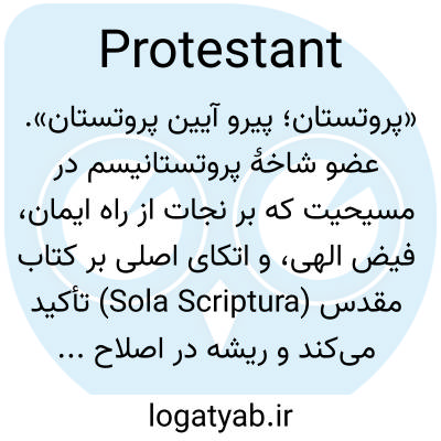«پروتستان؛ پیرو آیین پروتستان». عضو شاخهٔ پروتستانیسم در مسیحیت که بر نجات از راه ایمان، فیض الهی، و اتکای اصلی بر کتاب مقدس (Sola Scriptura) تأکید می‌کند و ریشه در اصلاح دینی سدهٔ ۱۶ میلادی دارد.