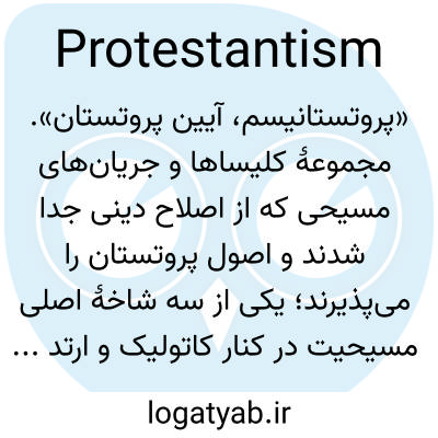 «پروتستانیسم، آیین پروتستان». مجموعهٔ کلیساها و جریان‌های مسیحی که از اصلاح دینی جدا شدند و اصول پروتستان را می‌پذیرند؛ یکی از سه شاخهٔ اصلی مسیحیت در کنار کاتولیک و ارتدوکس.