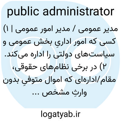 مدیر عمومی / مدیر امور عمومی | ۱) کسی که امور اداریِ بخش عمومی و سیاست‌های دولتی را اداره می‌کند. ۲) در برخی نظام‌های حقوقی، مقام/اداره‌ای که اموال متوفیِ بدون وارثِ مشخص را مدیریت می‌کند.