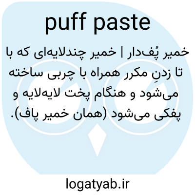 خمیر پُف‌دار | خمیر چندلایه‌ای که با تا زدنِ مکرر همراه با چربی ساخته می‌شود و هنگام پخت لایه‌لایه و پفکی می‌شود (همان خمیر پاف).