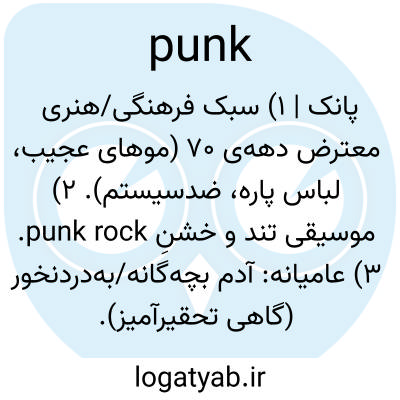 پانک | ۱) سبک فرهنگی/هنری معترض دهه‌ی ۷۰ (موهای عجیب، لباس پاره، ضدسیستم). ۲) موسیقی تند و خشنِ punk rock. ۳) عامیانه: آدم بچه‌گانه/به‌دردنخور (گاهی تحقیرآمیز).