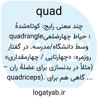 چند معنی رایج: کوتاه‌شدهٔ quadrangle؛ حیاط چهارضلعی وسط دانشگاه/مدرسه. در گفتار روزمره: «چهارتایی / چهارمقداری» (مثلاً در بدنسازی برای عضلهٔ ران – quadriceps). گاهی هم برای «وسایل چهار‌چرخ» مثل quad bike به‌طور خلاصه.