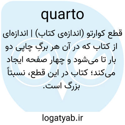 📌 کتابی با اندازه حدود 9.5 × 12 اینچ (24 × 30 سانتیمتر)، که با دو بار تا زدن صفحات چاپ شده برای تشکیل چهار برگ یا هشت صفحه تعیین میشود. 4to, 4°