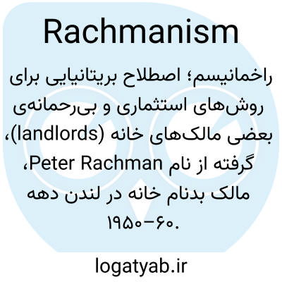 راخمانیسم؛ اصطلاح بریتانیایی برای روش‌های استثماری و بی‌رحمانه‌ی بعضی مالک‌های خانه (landlords)، گرفته از نام Peter Rachman، مالک بدنام خانه در لندن دهه ۱۹۵۰–۶۰.