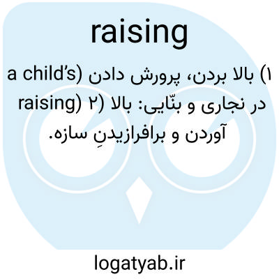 ۱) بالا بردن، پرورش دادن (a child’s raising) ۲) در نجاری و بنّایی: بالا آوردن و برافرازیدنِ سازه.