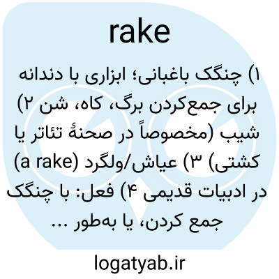 ۱) چنگک باغبانی؛ ابزاری با دندانه برای جمع‌کردن برگ، کاه، شن ۲) شیب (مخصوصاً در صحنهٔ تئاتر یا کشتی) ۳) عیاش/ولگرد (a rake) در ادبیات قدیمی ۴) فعل: با چنگک جمع کردن، یا به‌طور استعاری «زیر و رو کردن/به دقت گشتن».