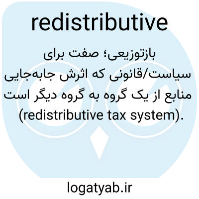 بازتوزیعی؛ صفت برای سیاست/قانونی که اثرش جابه‌جایی منابع از یک گروه به گروه دیگر است (redistributive tax system).