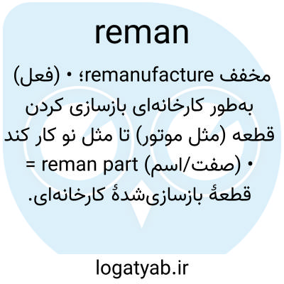 مخفف remanufacture؛ • (فعل) به‌طور کارخانه‌ای بازسازی کردن قطعه (مثل موتور) تا مثل نو کار کند • (صفت/اسم) reman part = قطعهٔ بازسازی‌شدهٔ کارخانه‌ای.