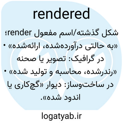 شکل گذشته/اسم مفعول render؛ «به حالتی درآورده‌شده، ارائه‌شده» • در گرافیک: تصویر یا صحنه «رندرشده، محاسبه و تولید شده» • در ساخت‌وساز: دیوار «گچ‌کاری یا اندود شده».