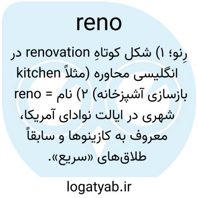 رِنو؛ ۱) شکل کوتاهِ renovation در انگلیسی محاوره (مثلاً kitchen reno = بازسازی آشپزخانه) ۲) نام شهری در ایالت نوادای آمریکا، معروف به کازینوها و سابقاً طلاق‌های «سریع».