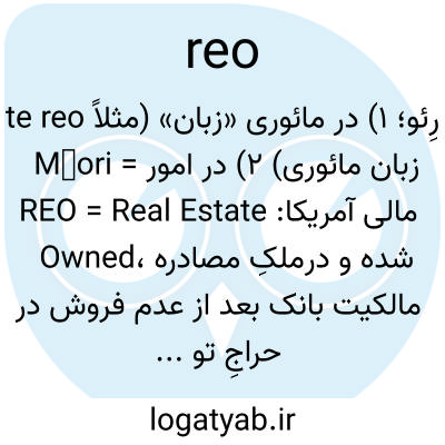 رِئو؛ ۱) در مائوری «زبان» (مثلاً te reo Māori = زبان مائوری) ۲) در امور مالی آمریکا: REO = Real Estate Owned، ملکِ مصادره‌شده و در مالکیت بانک بعد از عدم فروش در حراجِ توقیف.