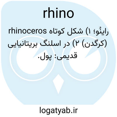 راینُو؛ ۱) شکل کوتاه rhinoceros (کرگدن) ۲) در اسلنگ بریتانیایی قدیمی: پول.