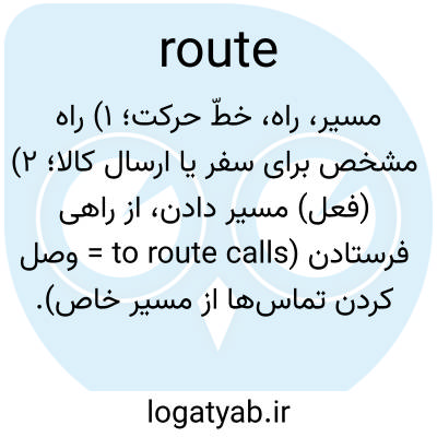 مسیر، راه، خطّ حرکت؛ ۱) راه مشخص برای سفر یا ارسال کالا؛ ۲) (فعل) مسیر دادن، از راهی فرستادن (to route calls = وصل کردن تماس‌ها از مسیر خاص).