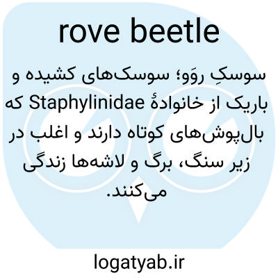 📌 هر یک از سوسکهای متعدد خانوادهی استافیلینیده، که بدنی باریک و کشیده و بالهای جلویی بسیار کوتاه دارند و قادر به دویدن سریع هستند.