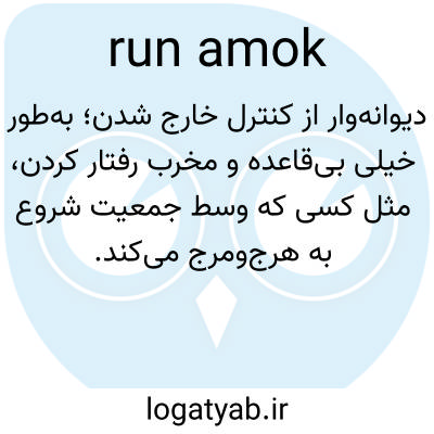 📌 همچنین،. رفتاری دیوانه‌وار، خارج از کنترل یا لجام‌گسیخته داشته باشید. برای مثال، می‌ترسیدم که اگر کودک نوپا را تنها بگذارم، دیوانه‌وار بدود و آرام شدن برایش سخت باشد، یا علف‌های هرز در چمن می‌دوند، یا بچه‌ها در زمین بازی وحشی می‌دویدند. Amok از یک کلمه مالایی به معنای "دیوانه‌وار" گرفته شده است و در نیمه دوم دهه 1600 وارد انگلیسی شد و ابتدا amuck نوشته می‌شد. Run riot به اوایل دهه 1500 برمی‌گردد و از یک معنای قدیمی‌تر، یعنی دنبال کردن بوی یک حیوان توسط یک سگ شکاری، گرفته شده است. Run wild به حیوانی اشاره دارد که به حالت طبیعی و پرورش نیافته خود بازمی‌گردد. کاربرد مجازی آن به اواخر دهه 1700 برمی‌گردد.